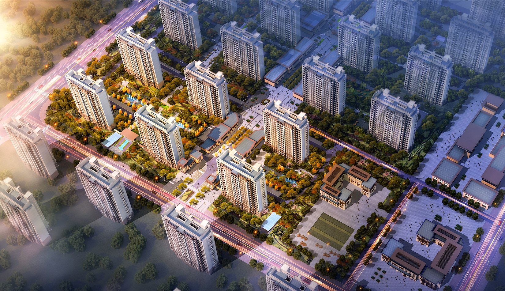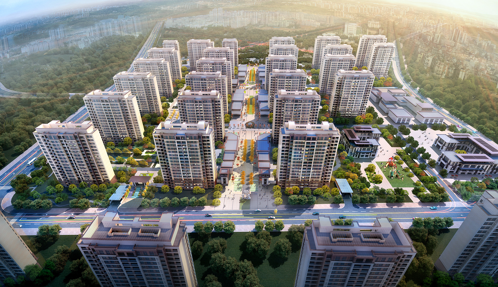 該項(xiàng)目尊重已有地塊規(guī)劃設(shè)計(jì),保留原有空間功能軸線、大小平嶺村安置區(qū)布局;根據(jù)周邊用地、交通情況布局配套商業(yè)、幼兒園。