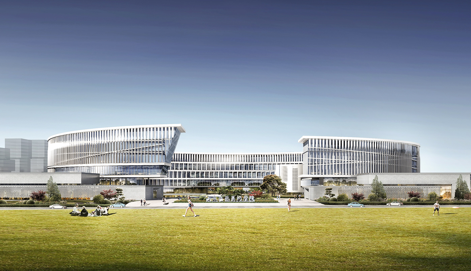 建筑方形體量運(yùn)用魯班鎖的本質(zhì)——榫卯結(jié)構(gòu),進(jìn)行體塊塑造,將這種天人合一的工匠精神貫穿整個(gè)校園。立面材質(zhì)上,采用石材及具有中國(guó)古典韻味的磚幕墻,體現(xiàn)學(xué)校厚重的文化底蘊(yùn)?!棒敯嗑€”交織在教學(xué)綜合體所在的圓形體塊上,利用動(dòng)感流線型的線條,使建筑更具有藝術(shù)氣息。