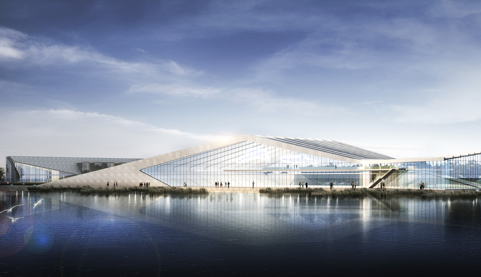 海洋科技館坐落在中科院青島科教園沿海區(qū)的中心地帶,沿海岸線呈一字型布局。方案設計以浪花和貝殼為意象,建筑像從場地中生長出來,擁有著與海浪一樣流暢的外形,在與基址和諧相融的同時,也呼應著青島的城市文化和人文關(guān)系。大跨度鋼結(jié)構(gòu)結(jié)構(gòu)排架為大空間的開放展示提供了可能,同時營造了無間斷的觀海空間??萍拣^外墻以玻璃幕墻為主,保證了觀海景觀通透性。