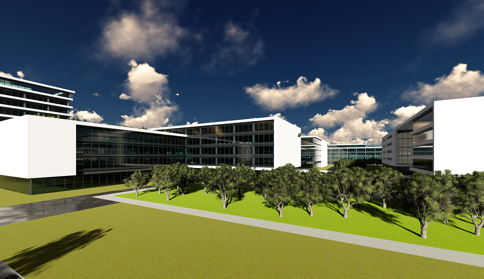 用全圍合式布局,形成兩個能量環(huán),為整個園區(qū)輸送無限動力。活力三環(huán)的自由、靈活的建筑布局形式,為多元化的企業(yè)辦公提供各種空間選擇?;盍θh(huán)均與雙核中心相連,在吸取核心研發(fā)產(chǎn)業(yè)鏈能力同時,不斷提升自己,向雙核中心注入新活力。通過五環(huán)的建筑空間形式,將多元功能塊組合在一起,形成一個共生循環(huán)系統(tǒng)。