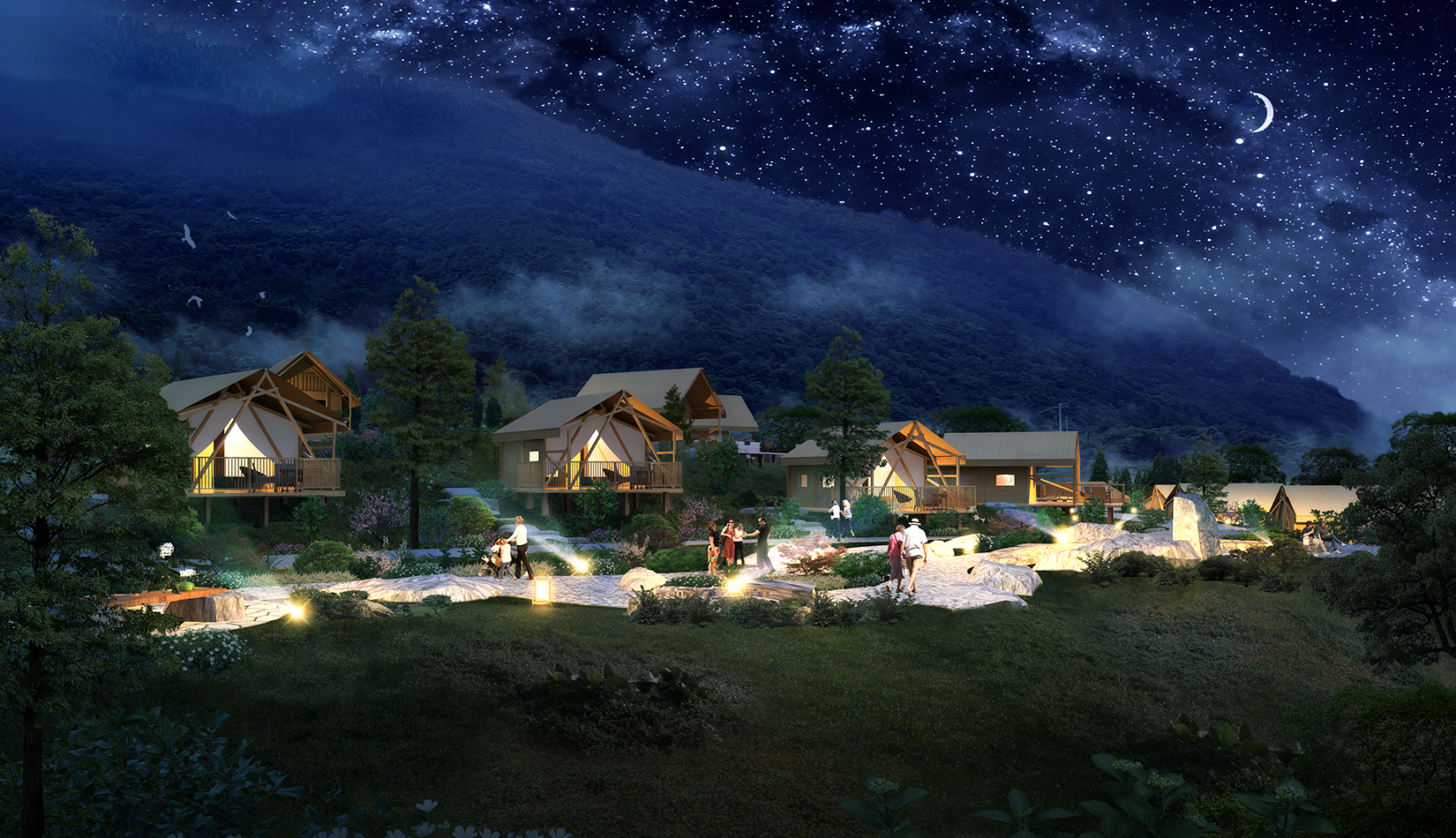 根據(jù)基地的地勢(shì)分布及功能需求,空間結(jié)構(gòu)上分為“一帶兩軸三核心五組團(tuán)”。建筑設(shè)計(jì)的五個(gè)組團(tuán),分別是濱水休閑組團(tuán)、水畔風(fēng)光帳篷組團(tuán)、高端養(yǎng)心帳篷組團(tuán)、中心服務(wù)組團(tuán)及山居野趣帳篷組團(tuán)??头坎糠植捎脦づ穸燃傥莸姆绞?,凸顯野奢度假的浪漫形式。