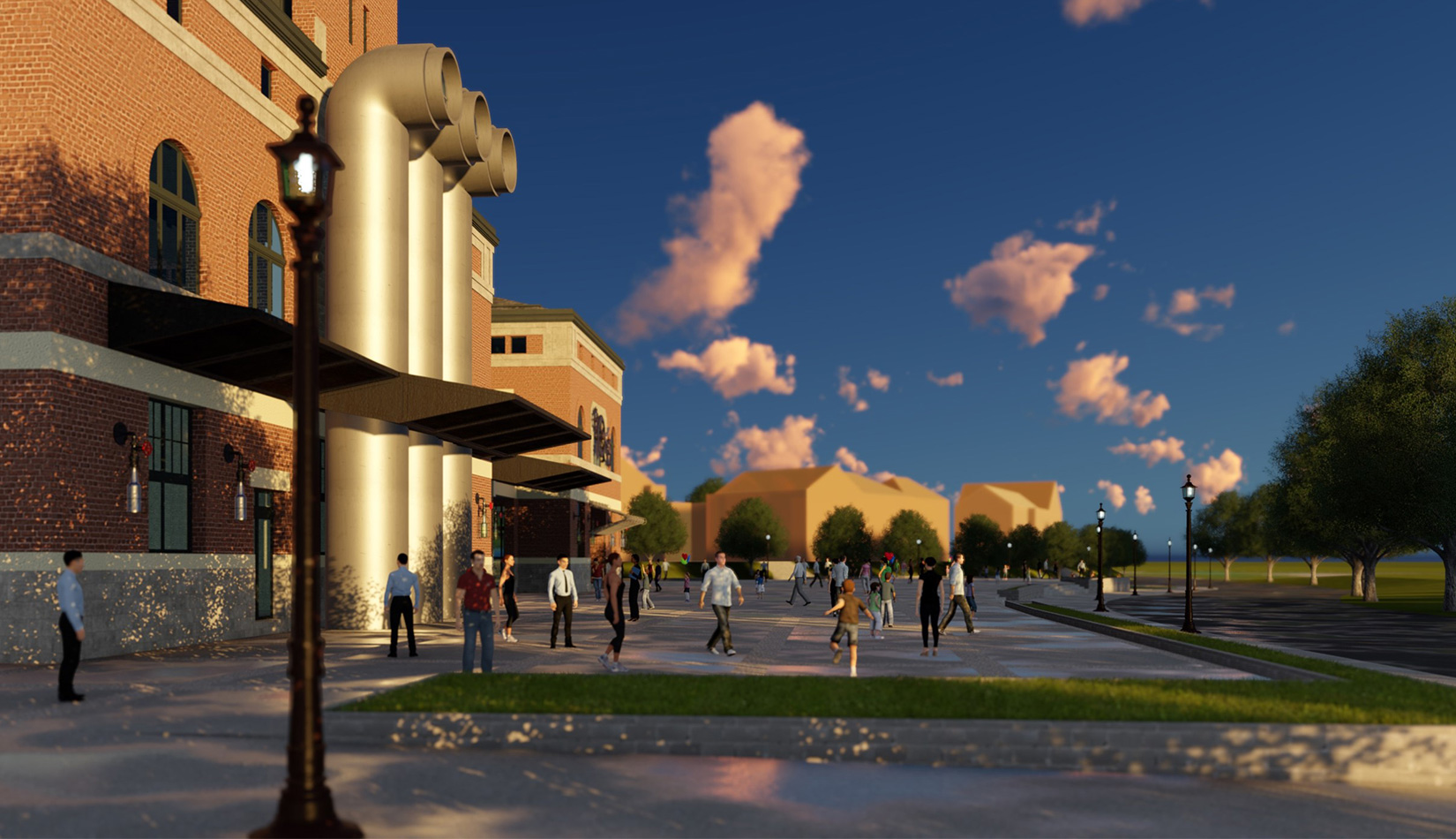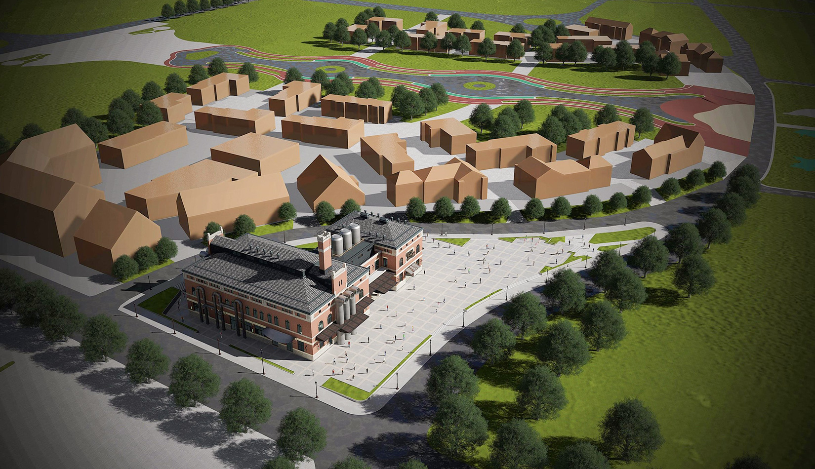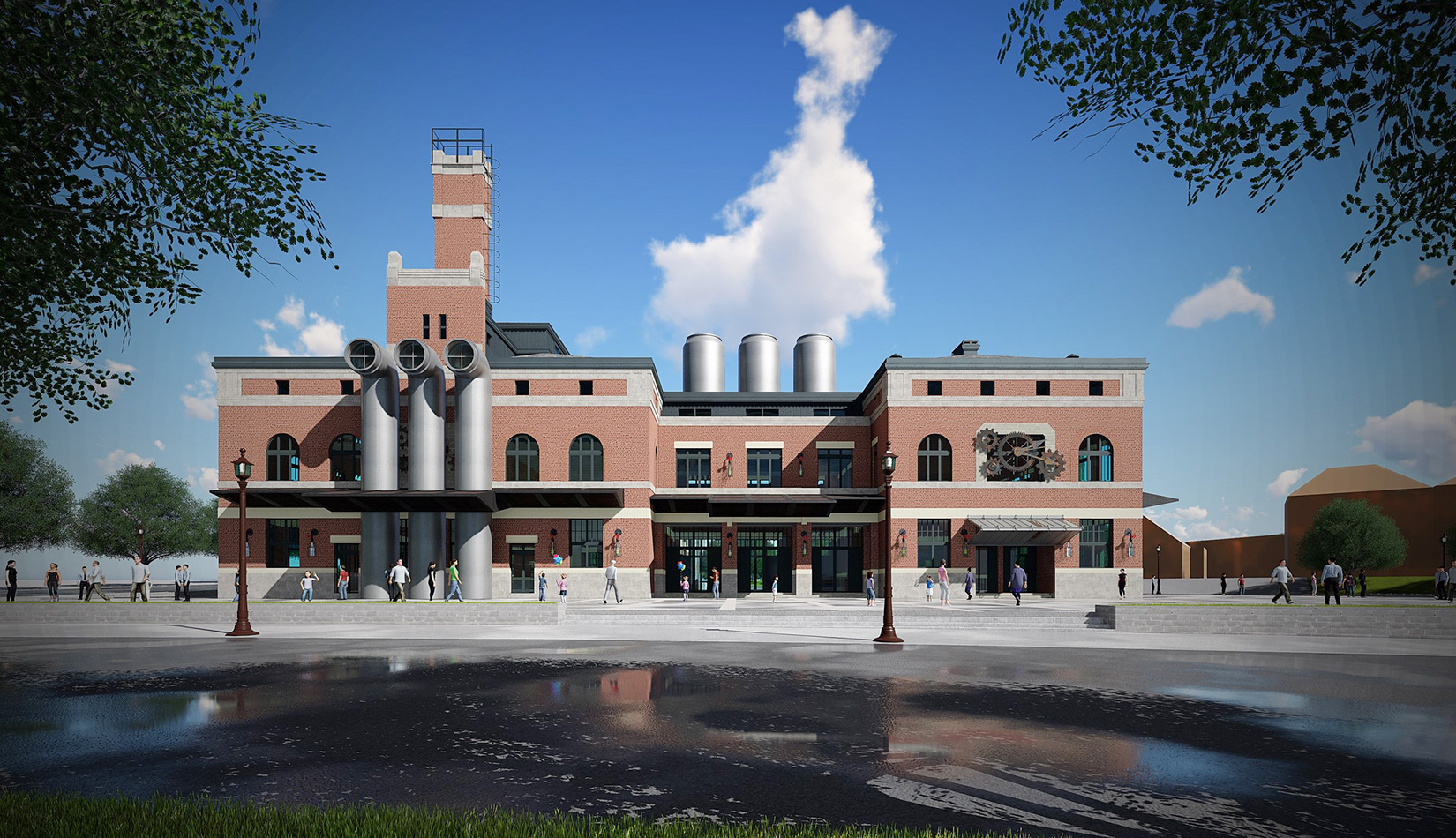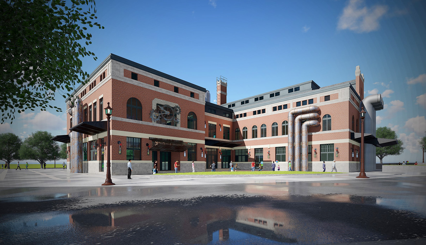 紅磚是工業(yè)風(fēng)的最佳表現(xiàn)元素之一,本案選取紅磚作為立面主要材質(zhì),加以真石漆、石材進(jìn)行點(diǎn)綴,磚塊與磚塊中的縫隙可以呈現(xiàn)有別于一般墻面的光影層次。屋面形式選取深灰色瓦屋面加以深色金屬板點(diǎn)綴,與立面形成強(qiáng)烈的視覺(jué)對(duì)比,旨在體現(xiàn)工業(yè)風(fēng)的粗獷氛圍。