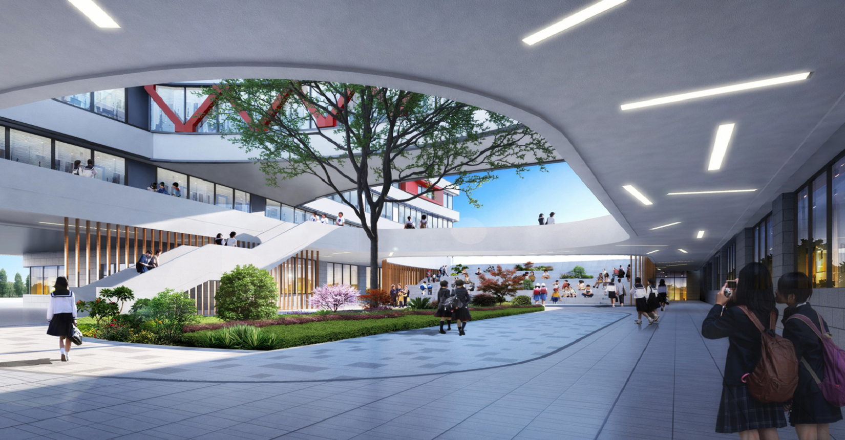校園規(guī)劃采用曲線手法,營造流水姿態(tài),將東側(cè)山脈與西側(cè)河流連接在一起。設(shè)計(jì)現(xiàn)代化“山水”校園,使學(xué)生在自然中成長。營造活水發(fā)源的“源頭”意境,寓意教育為人類文化長河的源頭,呼應(yīng)學(xué)?!霸搭^”文化。曲線舒展的形體,整體采用白色色調(diào),局部以紅黃色進(jìn)行點(diǎn)綴,風(fēng)格純潔又不失活潑。