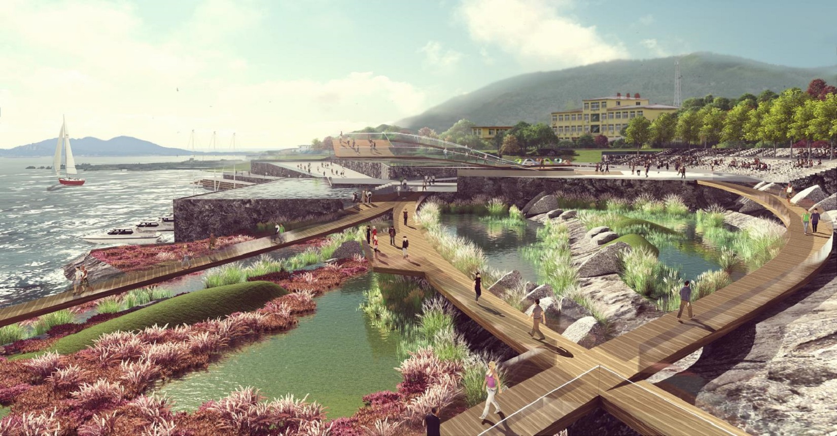該項(xiàng)目以露天海洋科技博物館為設(shè)計(jì)理念,打造一個(gè)集生態(tài)保育、展示教育、科學(xué)科普、交流傳播、旅游觀光等功能于一體的國(guó)家級(jí)愛(ài)國(guó)主義教育基地。設(shè)計(jì)是以地域性、生態(tài)性、智慧性為指導(dǎo)原則,將整個(gè)海岸帶劃分為五個(gè)分區(qū)進(jìn)行設(shè)計(jì),包含了科研、文教、生活三個(gè)方面,重塑海洋價(jià)值觀,打造一個(gè)海洋科技交流平臺(tái)。
